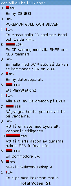 Detta är de viktigaste som har hänt under året. Vi kommer att fortsätta och leverera er de allra hetaste nyheterna inom allt som rör emulatorer och även lite av det mest intressanta ifrån spelvärlden. SEN kommer att växa och få fler och fler sektioner. Vi har många planer på gång och under 2001 kommer SEN att bli en av de absolut bästa emu-sidorna. Trots att den är helt på svenska.