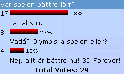 Vi har lite problem med servern och kan inte uppdatera pollen med en ny fråga. Problemet gör även så att bakgrunden i den fortfarande är gul vilket inte är så vackert. Vi jobbar på problemet och hoppas att det skall vara löst snart.