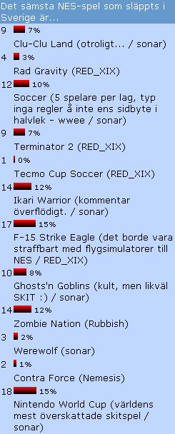 Japp... För er som vill kika in någon av de 36 pollarna som har varit hittils i SENs två år långa historia så finns det nu länkar upplagda till dem på pollsektionen. Här kan man bland annat få reda på vad klockan oftast är, hur många av SENs besökare som är oskulder och om det är olika smak på de olikfärgade Ahlgrens bilarna eller inte... ta en titt!